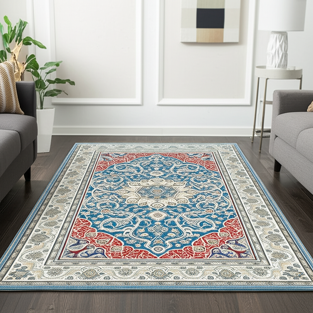 Bu halı, büyüleyici bir çiçekli madalyon desenine sahiptir. Mavi, kırmızı ve bej tonlarındaki zarif desen, yaşam alanınıza sofistike ve zamansız bir dokunuş katar. Bu seçkin halı, her odaya sıcaklık ve stil getirecektir.