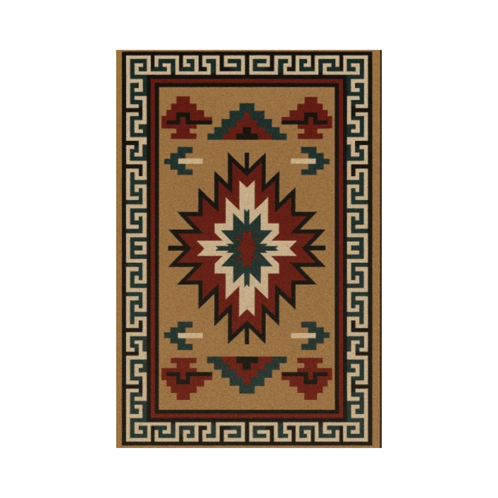 Bu halı, geometrik şekiller ve desenlerle Güneybatı esintili bir tasarıma sahiptir. Renk paleti, ten rengi bir zemin üzerinde kırmızı, beyaz, teal ve siyah tonlarını içererek sıcak ve davetkâr bir görünüm oluşturur. Bordürde Yunan anahtarı deseni bulunur.