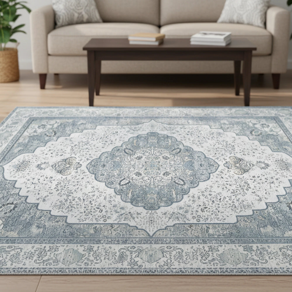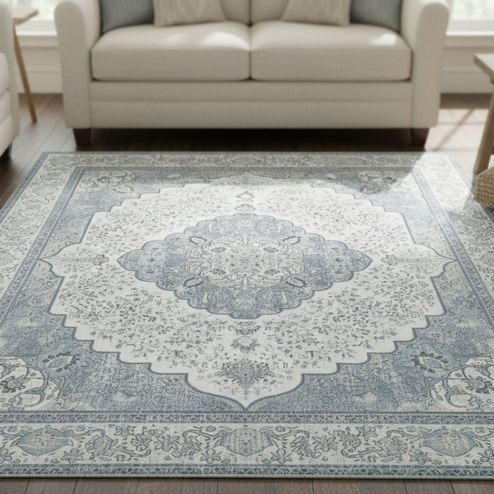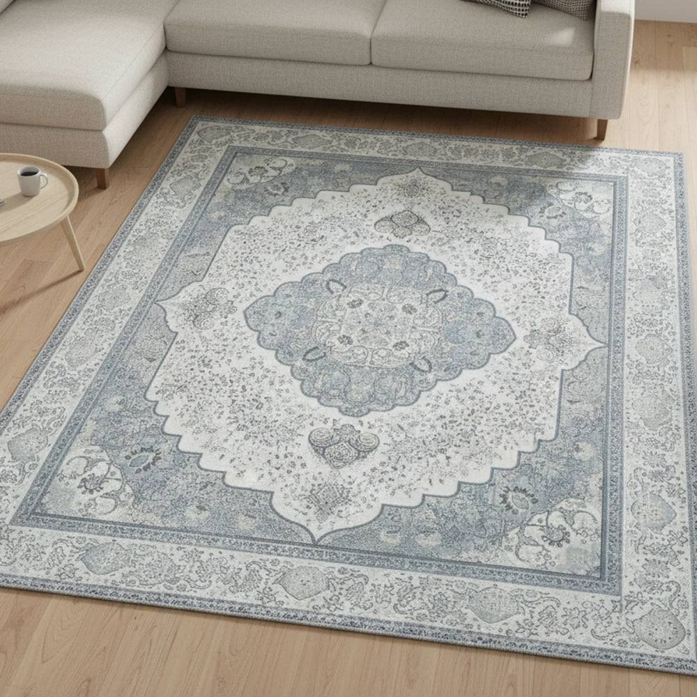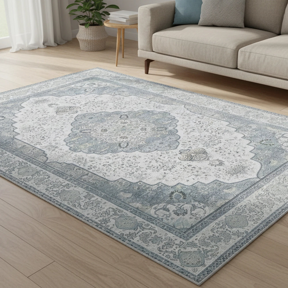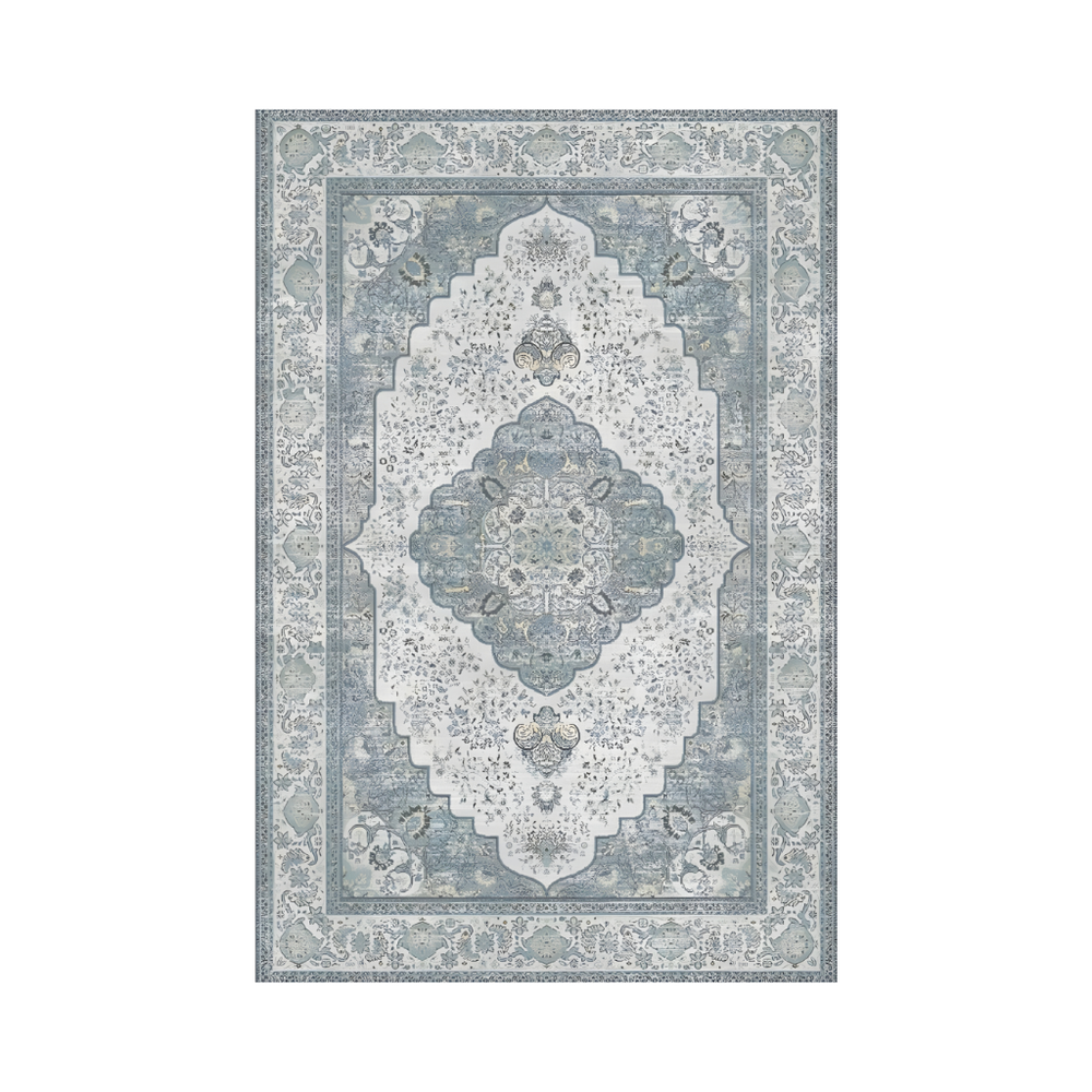 Bu çevre dostu halı, açık mavi-gri ve soluk gri tonlarında çiçek desenleriyle zamansız bir cazibe ve sade bir lüks hissi uyandırır. Geometrik şekiller ve bordür desenleri, yumuşak dokulu örgü yüzeyi tamamlayarak derinlik ve görsel ilgi katar. Vintage estetik, her odada sakin ve davetkâr bir atmosfer yaratır.