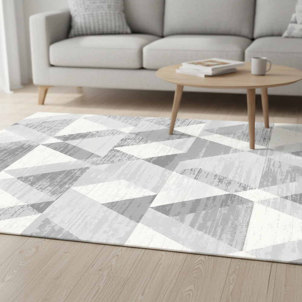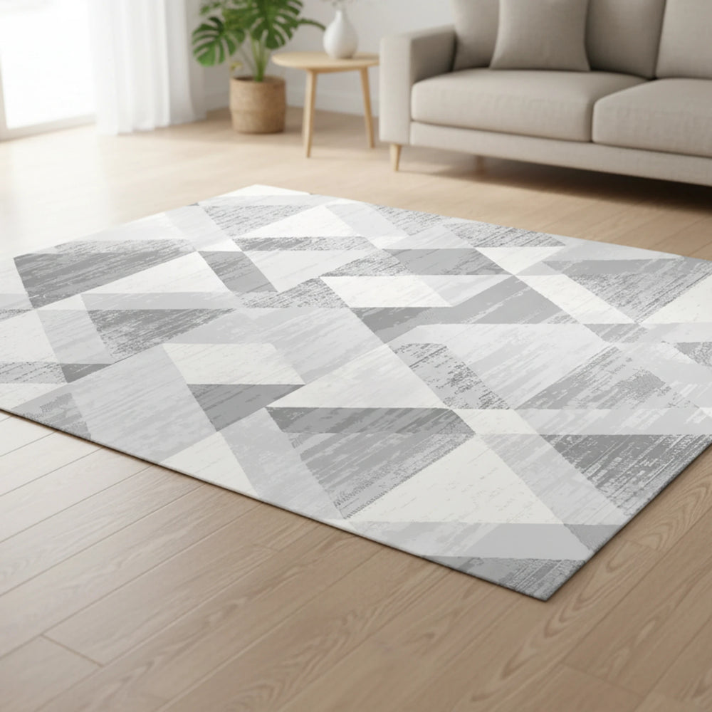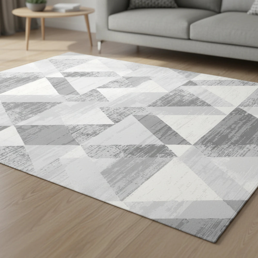 Bu soyut üçgen halı ile oturma odanıza modern geometrik bir stil kazandırın. Gri desenli tasarım, her mekâna çağdaş bir doku katar. Zemin dekoru olarak mükemmeldir! Bu çevre dostu halı, nötr gri ve kırık beyaz tonlarında dokulu üçgenlerden oluşan soyut geometrik bir tasarıma sahiptir ve modern, sofistike bir görünüm sunar.